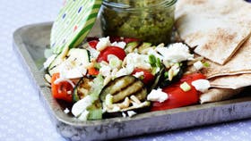 Grillede grønsager: Skyl aubergine og squash og skær dem i 1 cm tykke skiver. Rens peberfrugterne og skær dem i brede strimler. Pensl grønsagerne med olie på begge sider og krydr med spidskommen, salt og peber. Steg grønsagerne på en hed (grill)pande i ca. 1 min. på hver side, så de får tydelige grillstriber. Rens forårsløgene og snit dem fint. Bræk fetaen i mindre stykker. Rist pinjekernerne på en tør, varm pande, til de bliver let gyldne.