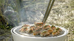 Forbered grillen, evt. ved at starte med grillstarteren, og fyld kullene i en lille bordgrill. Blend pestoen af basilikum, pinjekerner, olie, salt og peber og lidt revet parmesanost. Klip hummerne op i ryggen, kræng dem lidt til side og smør pesto ned i klippefladen. Sæt dem på grillens rist lige over gløderne og grill ca. 2 min., til de har taget lidt farve på underskallen. Spises med citron og flute og et godt glas hvidvin, som f.eks. riesling.