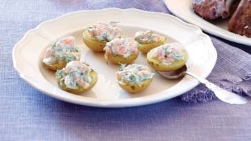 Kog kartoflerne i 12 min. Halver dem på langs. Læg dem på alufolie og grill dem, til skalsiden tager farve. Hak imens laksen med dild, cremefraiche, citronskal, salt og peber. Læg en skefuld på hver kartoffel og server lun.