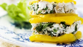 Pil skindet af de bagte peberfrugter med en lille urtekniv. Smør et lag ostecreme på halvdelen af peberfrugtstykkerne og læg dem sammen med den anden halvdel af stykkerne, så du får 6 flotte peberfrugtsandwicher. Pynt med basilikumblade og server godt brød til.