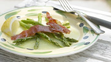 Knæk det nederste af de grønne asparges og steg dem 3-4 min. på en grillpande. Rist parmaskinken, bredt ud på bagepapir, i ovnen ved 200° i 5 min. Skæl og udkern agurken og skær den i mindre stykker. Kog agurkestykkerne i hønsesuppen i 5 min. Blend suppen med stavblender, så den skummer let. Hæld agurkeskummet ved de nygrillede asparges og anret med skinke. Drys med salt og peber.