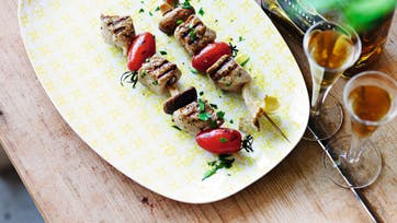 Skær koteletterne i store tern, ca. 3 x 3 cm. Stød korianderfrøene groft i en morter eller med en kniv på skærebrættet. Kom korianderfrø, grofthakket hvidløg og hvidvin i en plastikpose sammen med kødet. Lad det marinere i mindst 1 time. Tag kødet op af marinaden og tør det med køkkenrulle. Træk kødet på spid skiftevis med svampe og tomater. Pensl spid dene med olie og steg dem på alle sider på en grillpande. Krydr med salt og peber og drys med lidt hakket persille.