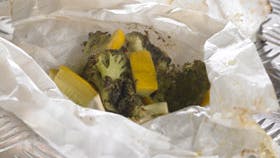 Skær løgene i smalle både, courgetterne i stave og del broccolien i små buketter. Pil hvidløgene og skær dem i tynde skiver. Læg grønsagerne blandet på bagepapir. Kom 1 spsk. pesto, lidt olivenolie, salt og peber over og luk pakkerne godt. Sæt dem i ovnen ca. 20 min. ved 200°.