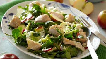 Snit forårsløgene i skrå skiver. Udkern æblerne og skær dem i både. Vend løg, kål, radiser og æbler i den sammenrystede dressing, og lige inden servering vendes de mange grønne blade i. Pynt med udskårede stykker af kylling og server med brød og kølig rosé.