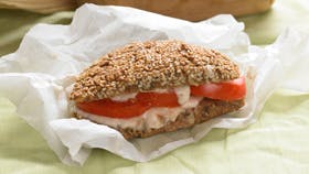 Flæk bollerne og fyld dem med salatblade, auberginepuré og tomatskiver. Kværn peber over og læg overdelen på.