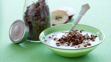Kog mælk og fløde op under omrøring og lad blandingen afkøle til 22-25° (brug gerne et stegetermometer). Tilsæt kærnemælken og fordel blandingen i 6 små skåle. Dæk skålene løseligt med bagepapir og et rent viskestykke og lad dem stå ved stuetemperatur i et lille døgn. Riv rugbrødet på den grove side af rivejernet eller hak det fint og rist det på en tør pande i 5 min. Tilsæt sukkeret og lad det riste med i et par min. Lad rugbrødsdrysset køle helt af og kom det i en lufttæt beholder. Stil tykmælken i køleskabet til den er rigtig kold, server den med rugbrødsdrys og frisk frugt.