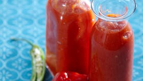 Skræl og riv gulerødderne. Hak løg og hvidløg. Bland gulerødder, løg, hvidløg, limesaft og vand og lad blandingen småkoge i 10 min. under låg. Vask chilierne, skær dem i mindre stykker og lad dem koge med sammen med saltet i yderligere 10 min. Blend chilisovsen, til den er helt glat, og kom den på skoldede flasker.