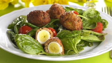 Kog vagtelæggene i 2 min., afkøl og pil dem. Smuldr brødet og bland det med ægget. Hak skinken fint og bland den med fintklippet purløg, æggeblandingen, paprika og peber til en fast fars. Pak de kogte vagtelæg ind i farsen og steg dem i olien ved høj varme, til de er jævnt gyldne. Skyl spinatbladene og bland dem med halverede cherrytomater. Pisk sennep og eddike med olien og smag til med salt og peber. Hæld dressingen over salaten og anret med vagtelæggene.