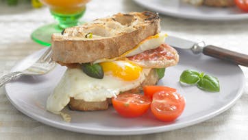 Læg brødene sammen med æg, pancetta og basilikumblade og server sammen med friske cherrytomater.