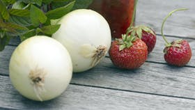 Skyl og nip jordbærrene og skær dem i halve. Pil og hak løget. Svits løget let i olien. Tilsæt resten af ingredienserne. Lad chutneyen koge uden låg 15-20 min. Hæld den i et skoldet glas og stil den koldt. Server til alle former for stegt kød og fjerkræ.