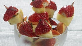 Skær skrællen af ananassen og skær den i tern. Skær nektarinerne i smalle både. Skyl, nip og halver jordbærrene. Stik frugten på træspid. Rør myntehonningen sammen og pensl den på frugten. Må meget gerne trække en times tid.