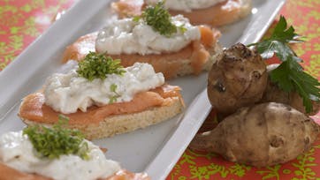 Skræl jordskokkerne og skær dem i mindre stykker. Kog dem meget møre i letsaltet vand og lad dem dryppe af. Mos dem med håndpisker og pisk dem med cremefraiche til en blød creme. Smag til med citronskal, -saft, salt og peber. Køl cremen af og server på fluteskiver med laks og karse.