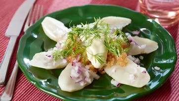 Skræl jordskokkerne, skær dem i ½ cm tykke skiver og læg dem i en gryde med lidt vand, ½ tsk. salt og 1 spsk. citronsaft. Kog dem 3-4 min., til de er møre med lidt bid og lad dem dryppe af i en sigte. Anret skiverne portionsvis med rogn, hakket rødløg, cremefraiche og kørvel eller dild.