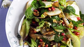 Halver granatæblet og pil kernerne ud. Hvis du banker på skallen med bagsiden af en ske, løsner kernerne sig og bliver nemmere at få ud. Fjern alle de hvide lameller, da de har en lidt bitter smag. Rist valnødderne på en pande i lidt olie. Vend forsigtigt alle ingredienser til jordskoksalaten sammen i en skål og smag til med salt og peber. Anret evt. salaten på et stort, dybt fad.