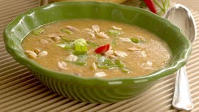 Varm suppen op og smag til med salt og peber. Server med jordnødder og forårsløg.