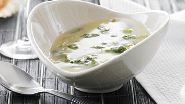 Kog kartoflerne møre i bouillon og purer blandingen gennem en grov sigte eller blend suppen. Skær porrerne i ringe og svits dem i smørret, til de er let gyldne. Rør porrer og cremefraiche i kartoffelsuppen og smag til med salt og peber. Blend persillen med olie, parmesanost, pinjekerner og hvidløg til en jævn pesto og smag til med salt og peber. Server suppen dryppet med pesto og desuden med groft flute.