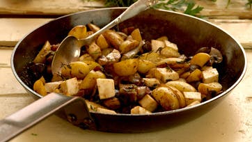 Rens alle ingredienserne og steg så bacon på panden, til det afgiver fedt. Kom løgene ved og dernæst kartofler i halve eller kvarte. Til sidst kommes selleri ved, og det drysses med salt og peber. Kommes i ildfast fad, overhældes med vin og stilles i ovnen i 20 min. ved 210°.