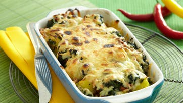 Pil kartoflerne og skær dem i mundrette stk. Hak løg, chili og hvidløg og knug spinaten fri for væde. Sautér løg, hvidløg og chili i olie, tilsæt de hakkede tomater og oliven samt spinat. Krydr med salt og peber og bland med kartofler. Kom blandingen i et ovnfastfad, riv osten over og gratinér retten i 10 min. ved 225°.