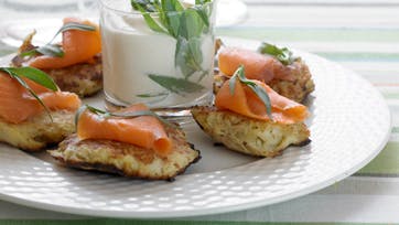 Rør cremefraiche med estragon og salt og peber og kom i et glas, der stilles i midten af et stort fad. Rundt om lægges de varme kartoffelkager, og røget laks lægges på. Pynt med estragon.