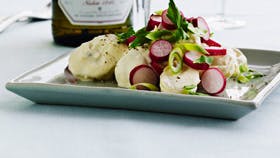 Skær radiserne og forårsløgene i skrå skiver. Tag lidt af grønsagerne fra til pynt og vend resten i dressingen sammen med kartoflerne. Smag til med salt og peber.