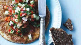 Tomatsalsa: Rør olivenolie og æblecidereddike sammen. Skær tomater, peberfrugt og agurk i små tern. Pil rødløget og hak det fint. Vend de hakkede grønsager rundt i dressingen sammen med hakket persille og smag til med salt. Server tortillaen med tomatsalsa, rugbrød og evt. smør.
