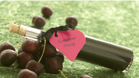 Kog kirsebær op med vand, ingefær og peber i 10 min. Sigt kirsebærsaften gennem et klæde og hæld den tilbage i gryden sammen med sukkeret. Kog saften op igen og lad den småsimre i 10 min., til den begynder at tykne. Tilsæt mandelessensen, hæld siruppen på flaske og lad den afkøle.
