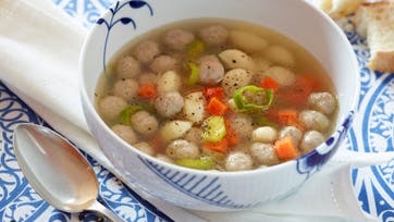 Rør alle ingredienser til farsen sammen undtagen mælk, der bruges til at justere konsistensen med. Lad farsen hvile i køleskab i 30 min. Form bittesmå boller og kog dem i saltet vand i 3 min. Kom dem i suppen lige inden servering.