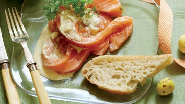 Skær laksen i tynde skiver ned mod skindsiden og anret dem sammen med sennepssaucen og lidt kørvel.