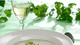 Pil og skræl løg og kartofler og sauter dem i små stykker i smør. Hæld fond på og kog mørt. Blend med 3 bundter kørvel og jævn med fløde. Smag til og server helt varm. Drys med kørvel.