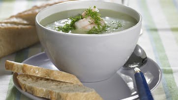 Kog ærter og løg med bouillonen under låg i 15 min. Blend ærtesuppen og tilsæt fløde og hvidvin. Smag til med salt og peber og stil suppen på køl, til den er helt kold. Server suppen med klippet dild, rejer og flute.