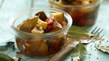 Skyl courgetterne og skær dem i tern. Skræl æblerne og skær dem i tern. Pil og hak løgene fint. Skyl og hak tomaterne groft. Skræl og riv ingefær fint. Pil og hak hvidløgene. Kom alle ingredienser i en gryde og bring langsom i kog. Lad det simre utildækket i 2 timer, til det er som mørk chutney.