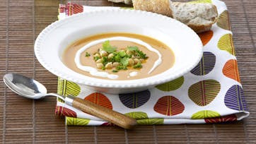 Tørrist spidskommen og chili i en gryde i 1 min. Kom olie og løg ved og sauter i 3 min. Kom linser, bouillon og tomater ved og lad det småkoge i 15 min. Blend suppen med en stavblender og hæld kikærterne i. Når det hele er kogt godt igennem, justeres med lidt vand, salt og peber, og der afsluttes med hakket koriander og en klat syrnet mælk af en slags i midten. Server med brød, der sikrer, at du også denne dag får alt det protein, du skal have, idet linser og ærter går sammen med groft brød og laver et protein, der ligner køds.