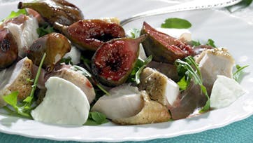Begynd med fignerne, hvor alt undtagen selve fignerne kommes i en gryde og koges sammen. Lad det simre i 10 min. Tilsæt så fignerne, kog i 3 min. og tag fignerne op. Lad lagen koge uden låg, så den reducerer til ca. 3 dl. Kom figner i halve på glas og hæld lagen over. Stil på køl og tag glasset med særskilt, hvis du skal langt med frokosten. Steg så kyllingefilet i ovn med salt, peber og olie over. Vend kylling i skiver med stykker af ost, skinke i mindre stykker og de krydrede figner, hvis lage bruges som dressing.