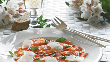 Rist pinjekernerne på en tør stegepande eller i mikroovn. Skær laksen i tynde skiver og læg dem på køleskabskolde tallerkner. Dryp olie og citronsaft over laksen. Høvl ost over og drys med citronskal og pinjekerner. Krydr med salt, peber og oregano. Server til frokost eller forret med groft brød.