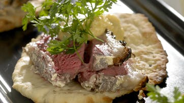 Gnid lam med citron, salt, peber og timian. Kom yoghurt, chili, frisk koriander og alle krydderierne i en foodprocessor og kør til en jævn masse. Læg kødet i denne og gnid det godt ind. Bland alt det tørre til brødet i en skål. Rør det våde sammen (lun evt. vandet og rør gæren ud heri). Kør det hele sammen med røremaskine og juster med mere vand eller mel. Lad det hæve i 1 time. Tænd for grillen. Del dejen i 12 boller og lad dem hvile i 15 min. Rul dem meget tyndt ud i aflang dråbefacon, tril dem i sesam og læg dem på en bageplade og grill dem i 2-3 min. på hver side. Steg lammeculotterne på grill i ca. 20 min., til de er rosa. Hvis de steges på ovnens grill, så sæt den på grill og varmluft og vend culotterne et par gange. Skær dem i skiver, som lægges på brødet sammen med tzatziki, humus, og hvad man nu synes.