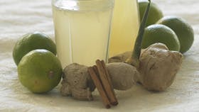 Skyl og tør limefrugterne og skær dem i tykke skiver. Læg dem i en stor skål sammen med kanel og ingefær i mindre stykker. Hæld det kogende vand over limen og lad det trække i 24 timer. Sigt blandingen, lad det dryppe godt af og kasser lime, kanel og ingefær. Varm limevandet op med sukkeret, lad det småsimre i 10 min. og køle af. Tilsæt saften af de 4 lime og hæld lime-o-naden på skoldede flasker og opbevar dem køligt. Server lime-o-naden fortyndet med vand efter smag.
