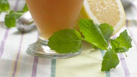Riv skallen af 2 af citronerne med et juliennejern og pres saften af alle citronerne. Bland citronsaften med sukker og halvdelen af mynten i en kande og rør rundt, til sukkeret er opløst. Tilsæt citronstrimler og knust is, sæt det i køleskabet i 20-30 min. Tag citronstrimlerne og mynte op og server limonaden med isterninger og et par mynteblade.
