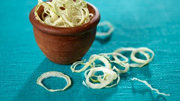 Pil et par løg og skær dem i meget tynde skiver. Bred dem ud på bagepapir og tør dem i ovnen et par timer ved 60° varmluft.