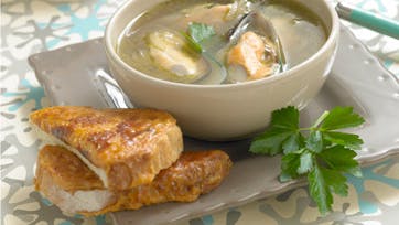 Tø muslingerne op. Pil løgene, skær dem igennem på langs og skær dem i skiver. Svits løgene let gyldne i 10-15 min. i smørret ved mellemvarme og jævnlig omrøring. Tilsæt pilsner og bouillon og lad suppen koge ca. 15 min. under låg. Tilsæt muslingerne og varm dem igennem. Smag til med hvidløg, salt og peber og server suppen med varme ostebrød.