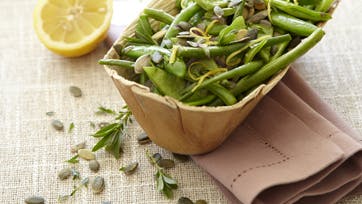 Svits haricots verts i ca. 4 min. i olien på en pande. Kom resten af bønnerne og ærterne i og svits 3-4 min. Tilsæt citronskal, -saft, salt, peber og græskarkerner og vend det rundt.