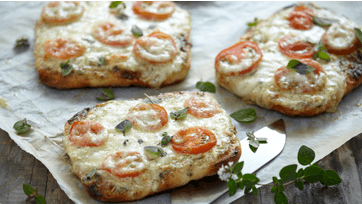 Læg brødene på en plade med bagepapir og rør mayonnaisen med sardeller, oregano og hvidløgspeber. Skær tomater og mozzarellaen i tynde skiver. Smør mayonnaisen på brødene og læg tomater og mozzarellaskiverne over. Bag brødene ved 220° i 8 min. og server dem lune eller kolde.