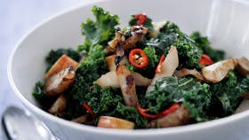 Lynstegte jordskokker med grønkål og chili