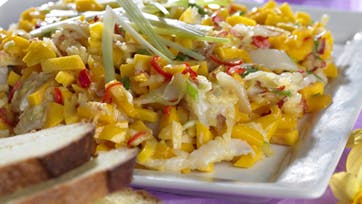 Skræl mangoerne og skær dem i tern. Skær hellefisken i mindre stykker og bland dem med mangoternene. Hak forårsløg og chili fint og vend dem i. Riv æblet på den grove side af rivejernet og vend det i mangosalaten. Pisk en dressing af olie, limesaft, sukker og vand. Smag dressingen til med salt og peber og vend den i salaten. Server med groft brød.