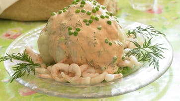 Kog blomkålen mør i saltet vand som helt hoved - det tager ca. 12-15 min. Stik i den for at mærke. Den må ikke være for hård. Rør dressing af cremefraiche, mayonnaise, salt, peber, dild og evt. lidt tomatkoncentrat og hæld det over det let afkølede blomkål. Drys med ærter og rejer og pynt med purløg og cherrytomater. Server med flute.