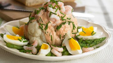 Rør dressingen sammen undtaget purløg. Kog blomkålen i saltet vand i hel form i 10 min. Den skal være sprødmør. Kog mindre stykker af grønne asparges, hvis nederste stykke er fjernet. Dryp kålen godt af. Kog æggene smilende i 7 min. Hæld dressing over kålen og pynt med æg i halve, asparges, rejer og hakket purløg. Server med groft brød.