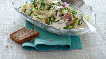 Salaten kan forberedes i god tid, men vent med at hælde saucen over sildene, til de skal serveres