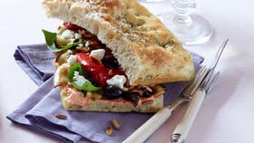 Skær løg, peberfrugt, courgette og aubergine i tynde skiver eller stænger. Læg dem i et fad og pensl med salt, peber, olie og eddike. Sæt fadet i ovnen ved 200° i 30-40 min. Lun brødet og smør det med en blanding af harissa og yoghurt. Læg grønsagerne på og top med pinjekerner, oliven, feta og basilikumblade.