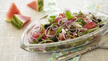 Skær løget i tynde skiver. Bland løg, sukker og vineddike og lad det stå 10 min. Skær melonen, uden kerner, i tern og skær fetaosten i tern. Bland melon, feta, oliven og rucola med løgene. Krydr med salt og peber og dryp olivenolie over.