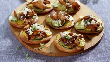 Fold dejen ud og udstik den i små pizzaer, ca. 8 cm. Skær courgetten i meget tynde skiver og bland dem med salt og olivenolie. Læg dem tæt på pizzaerne og bag dem midt i ovnen ved 225° 7-8 min. Svits kantarellerne sprøde på en stegepande i smør og giv dem lidt salt. Læg kantarellerne i en top på pizzaerne. Smuldr fetaosten over og afslut med timianblade og kværnet peber.