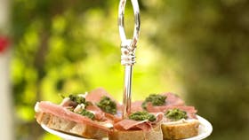 Skær flute i skiver og rist let i ovnen. Del i to portioner og fordel tynde skiver af andelever med en klat blomstergele på den ene halvdel og skinkestykker med pesto på den anden halvdel. Melonerne laves til mindre stykker og vikles med parmaskinke og en pind stikkes igennem. Serveres som hapsere i løbet af recpetionen.